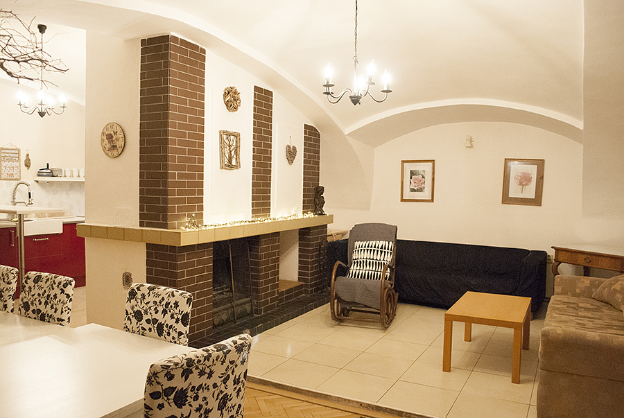 obyvaci hala s krbem a kuchyni